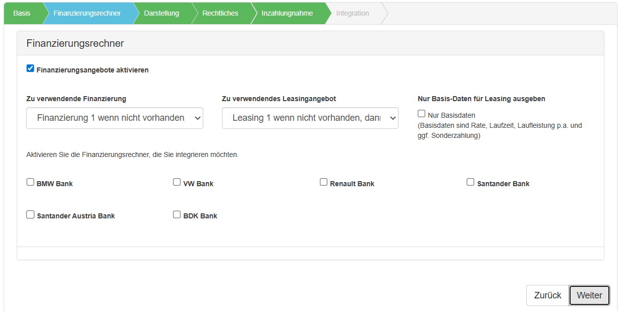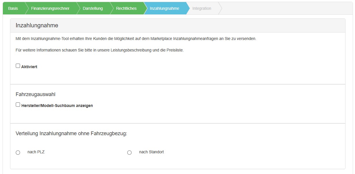 Im Reiter "Inzahlungnahme" aktiviert bzw. definiert, ob eine VIN eingetragen werden muss oder ob alternativ auch ein Fahrzeug mit Hersteller / Modellauswahl hinterlegt werden kann.