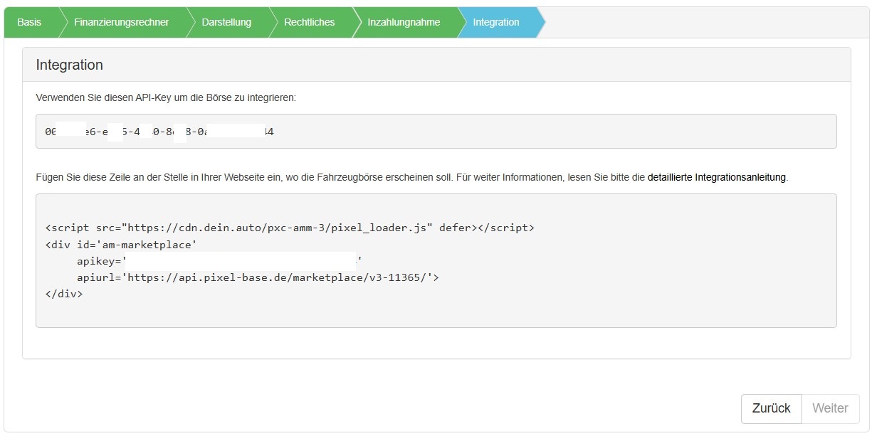 Der Marketplace kann mit einen API KEY und einen Script auf bestehende Webseiten eingebunden werden. API KEY und Script werden im letzten Reiter "Integration" der Konfigurationsstrecke bereitgestellt. Dieser Marketplace kann über die Konfigurationsstrecke bedingt individualisiert / parametrisiert werden. Weitergehende Parametrisierungen sind hier allerdings nicht möglich.