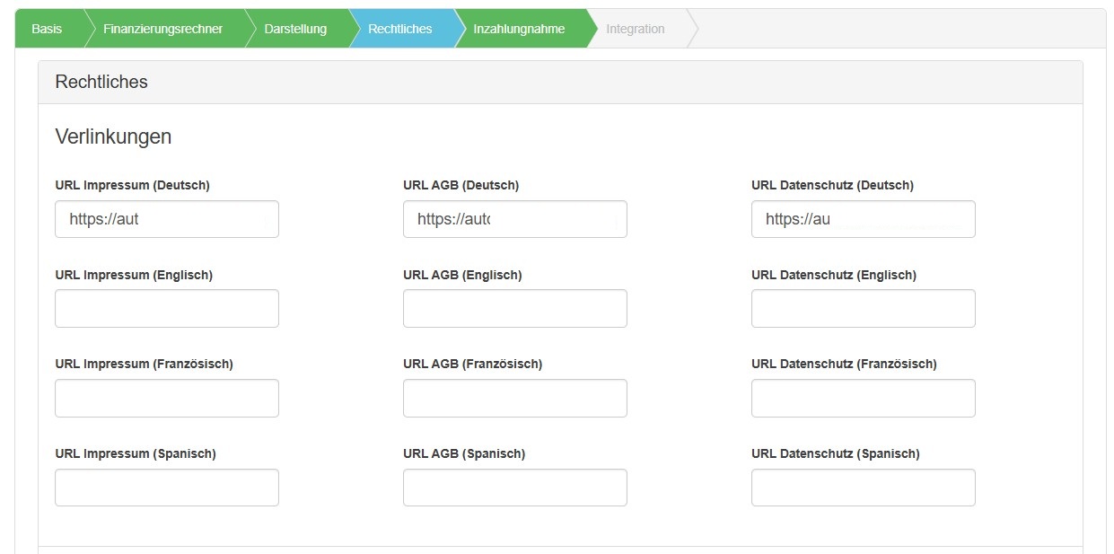 Im Reiter "Rechtliches" sollten die aktuellen URL - ggf. getrennt nach Sprache integriert werden, damit in den Anfragestrecken entsprechend auf die URLs Ihrer Webseite verwiesen werden kann.