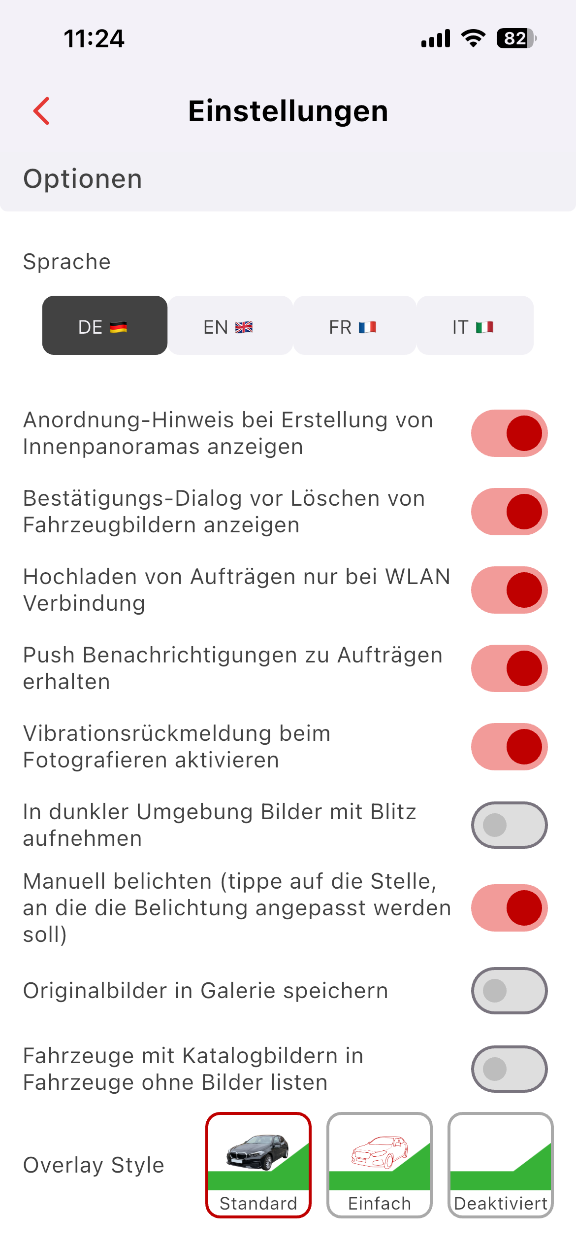 Hier kann die Einstellung der Overlays bei Aufnahmen über die App vorgenommen werden.