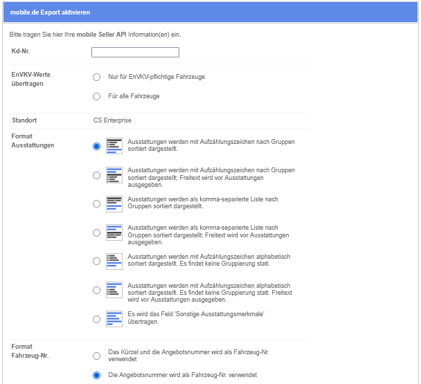 Hier können Sie festlegen, ob eine am Fahrzeug hinterlegtes Leasingbeispiel im Freitext oder als separater Einzelwert übertragen werden soll. Je nach Verkaufsplattform kann dies teilweise eingeschränkt sein oder mit Zusatzkosten einhergehen.