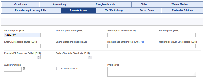 Im Bereich "Preise und Kosten" der Fahrzeugbearbeitung können Informationen zu Preisen und zu sonstigen mit dem Fahrzeug verknüpften Kosten gemacht werden.
