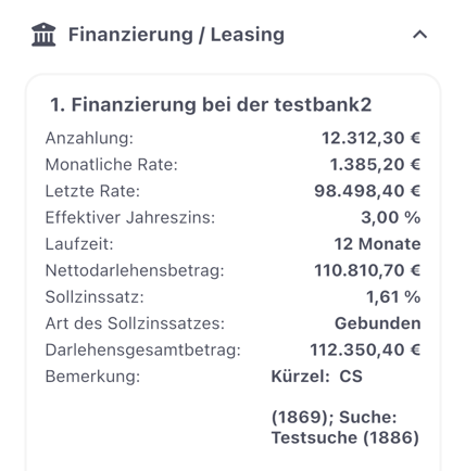 Im Bereich Finanzierung und Leasing sind die entsprechenden Informationen aufrufbar. Bei mehreren vorliegenden Informationen kann durch seitliches Wischen zwischen den Informationen gewechselt werden.