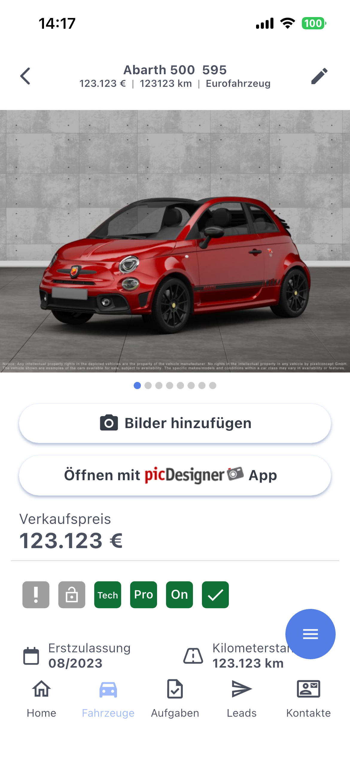 ersetzt werden. Die Verlinkung zur picDesigner App ist funktional, wenn es eine aktive Bildoptimierung gibt. Mit der Verlinkung wird dann das Fahrzeug in der picDesigner App aufgerufen und dort können Bilder gemacht bzw. in die Optimierung gegeben werden.