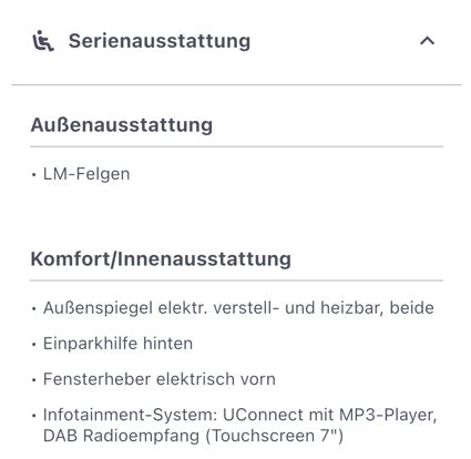 Die am Fahrzeug hinterlegte Serienausstattung wird in gruppierter Anzeige dargestellt.