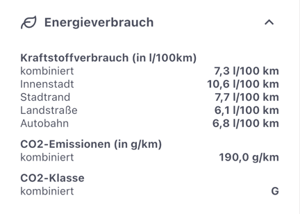 Im Bereich Energieverbrauch sind die am Fahrzeug hinterlegten Verbräuche und Emissionen sichtbar.