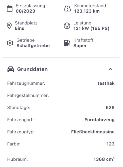 Im folgenden Bereich werden über die App editierbare Felder sowie Fahrzeuggrunddaten gezeigt.