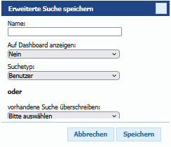 Zusätzlich kann eine bestehende gespeicherte Suche mit den neuen Sucheinstellungen überschrieben werden. Auch eine direkte Speicherung auf dem Dashboard ist möglich - dies ist jederzeit auch über die Verwaltung von gespeicherten Suchen editierbar.