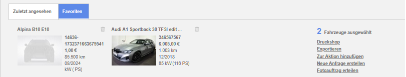 Im unteren Bereich der Listenansicht befindet sich eine Steuerfläche: Die Steuerfläche bietet in der Standardansicht folgende Optionen: Dropdown zum Markieren von Fahrzeugen als Favorit oder zum Deaktivieren Direktabsprung auf eine bestimmte Seite ...