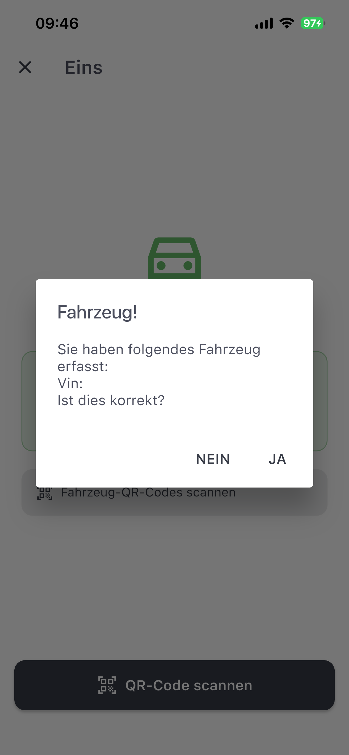 Mit einen Klick auf QR-Code scannen startet automatisch der Scan für einen Fahrzeug QR Code.