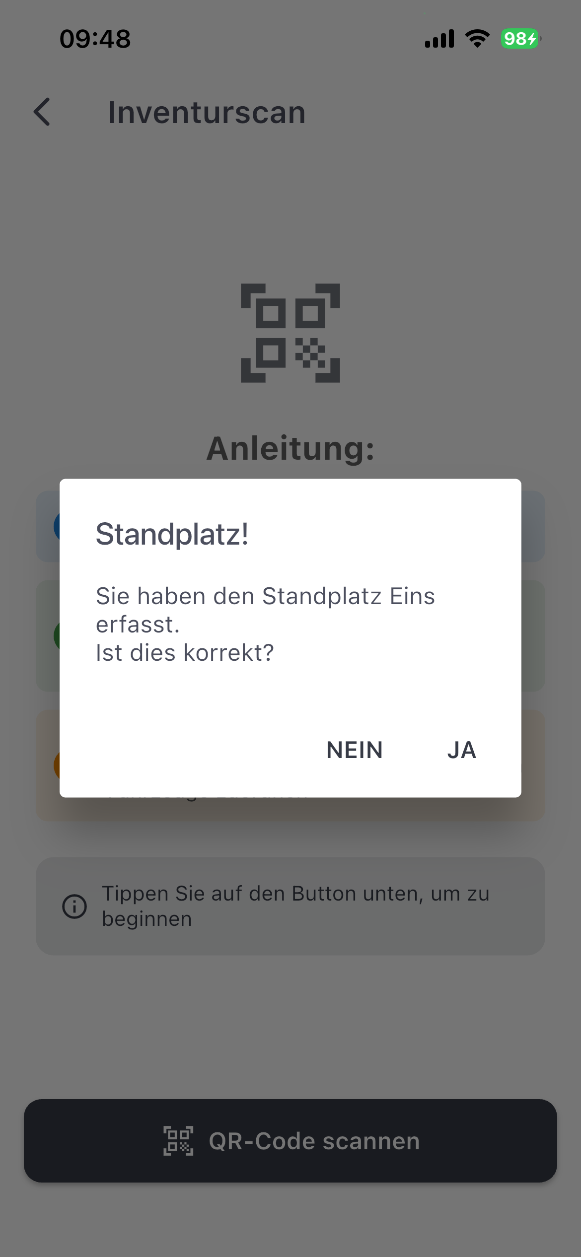 Mit einem Klick auf QR-Code Scannen wird die Kamera gestartet und es erfolgt kontinuierlich ein Scan bis ein Standplatz erkannt wird.