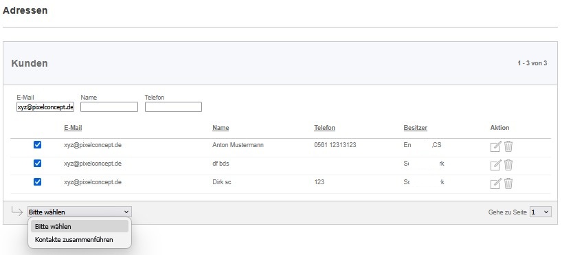 Hierzu werden die entsprechenden Kunden markiert und im Dropdown die Option Zusammenführen ausgewählt: