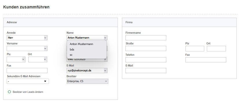 Kundenbearbeitung mit Auswahlen per Dropdown in den Feldern, in denen die vorher ausgewählten Kundenkontakte abweichende Daten haben. Es besteht auch die Möglichkeit, hier neue Daten einzutragen: