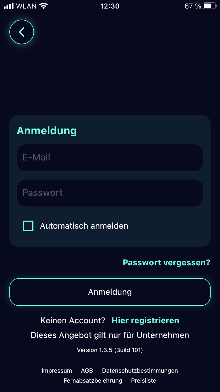 Nachdem Sie im Startscreen der App auf "Anmeldung" geklickt haben, sehen Sie diese Loginmaske: